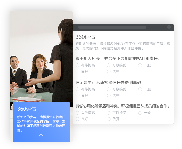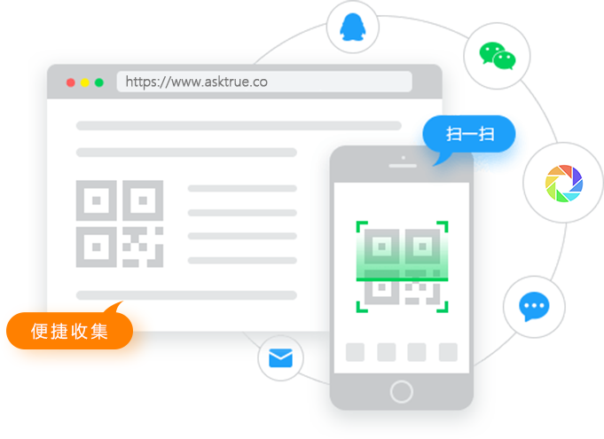 支持邮件、短信一键批量通知评价者,支持PC、手机多终端形式参与,支持微信扫码作答,可分享微信朋友圈、微信群、QQ群。