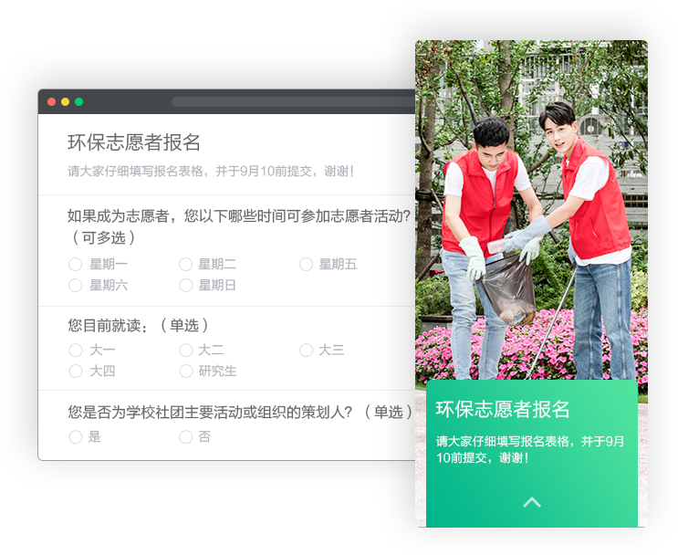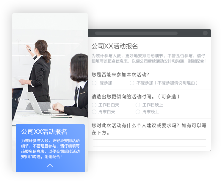 支持多种题型及报名信息字段,可灵活设计各种报名问卷表单,满足各种报名、登记需要。