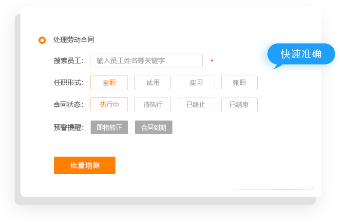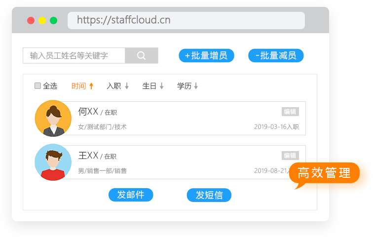 派遣员工往往数量巨大,又对应不同的签约单位,管理起来比较繁杂。云掌门可以帮您按签约客户、供应商、入职时间、所在部门等快速检索员工;可实时查看员工档案信息,并支持员工自主完善档案信息;支持对员工批量导入、批量减员等操作;提供发邮件、发短信等沟通功能。