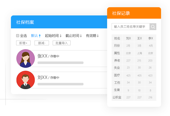 可以帮您根据不同城市配置不同的缴纳系数和比例,还可以为每个员工配置不同的社保、公积金档案,更可以根据配置好的社保、公积金档案一键核算缴纳金额,省时、省力、计算准确;同时支持社保、公积金的在线审批,还可以根据部门、员工快速查询社保、公积金的历史缴纳记录。